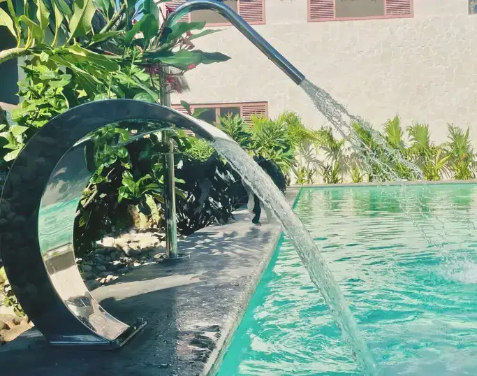 La Cascada Bali, con su fina lámina de agua, y la cascada cuello de cisne de 3HP ofrecen una experiencia similar a una masoterapia.